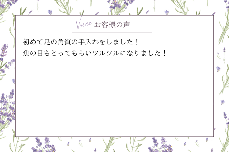 魚の目もとって、足ツルツル 2025年10月28日 最終更新日時 : 2025年10月28日 スタッフハルモニア ご提供コース 角質ケア 40分 フットケアのご感想 初めて足の角質の手入れをしました! 魚の目もとってもらいツルツルになりました!