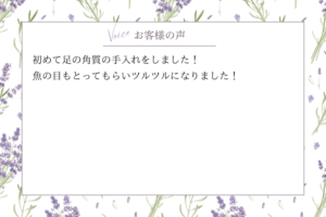 これからの時期は空気も乾燥してきますので、十分な保湿を心がけていただくと、足のしっとり&ツルツルが続きます。