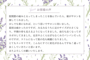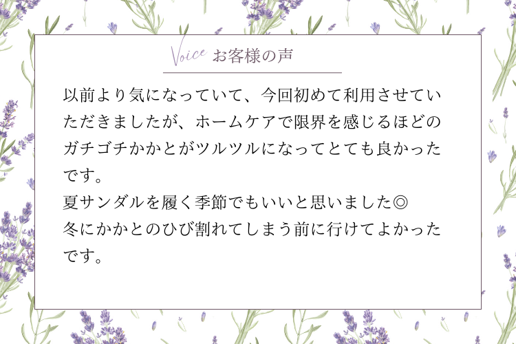 以前より気になっていて、今回初めて利用させていただきましたが、ホームケアで限界を感じるほどのガチゴチかかとがツルツルになってとても良かったです。