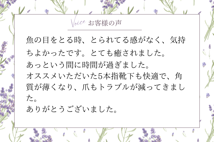 魚の目をとる時、とられてる感がなく、気持ちよかったです。とても癒されました。