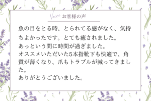 足つぼや角質ケア、かかとのケアなど、その日の体調に合わせた施術を通じて、心身のリフレッシュのお手伝いができますよう心掛けています。