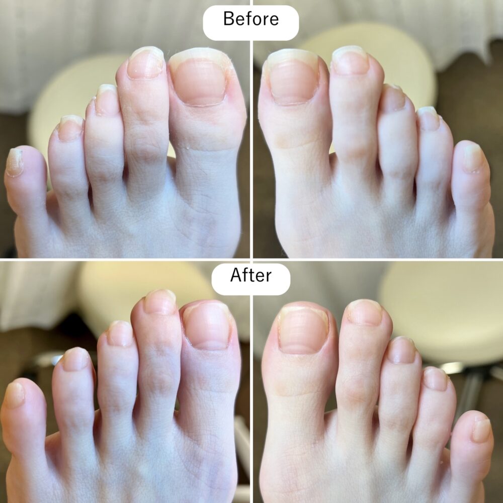 「自分で切るのが難しくて」とおっしゃっていた爪も、実は靴の中で伸びる方向を失い、湾曲してしまっていました。薬指が反り爪になっているのも、足指が曲がった状態で固定されていたから。爪周りの硬い皮膚も、靴との摩擦で守ろうとした体の反応だったんですね。